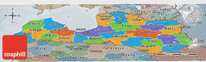 The panoramic political map represents one of many map types and styles available. Look at Latvia from different perspectives.