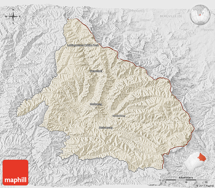 Shaded relief map shows landscape features, such as mountains, valleys and plateaus. Flat areas are smooth on the map, areas with steep slopes and mountains appear more rough. The above map of Mokhotlong was created using a digital elevation model.