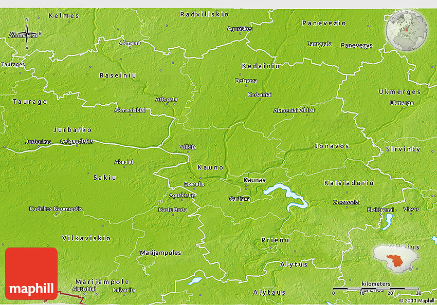 Physical map illustrates the mountains, lowlands, oceans, lakes and rivers and other physical landscape features of Kaunas. Differences in land elevations relative to the sea level are represented by color.