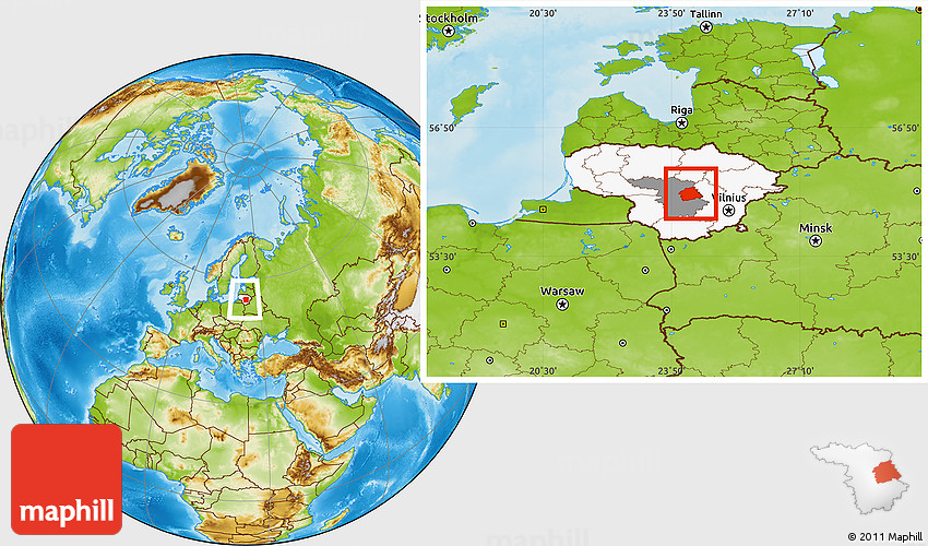 Maphill is a collection of map images. This image combines a physical map with the globe centered on Jonavos. Use the buttons under the image to switch to different map types.