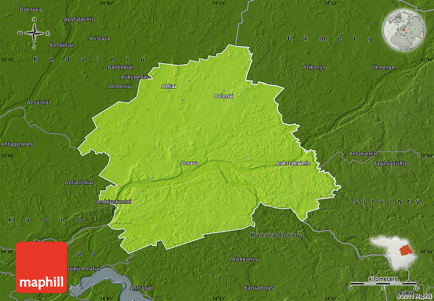 Physical map illustrates the mountains, lowlands, oceans, lakes and rivers and other physical landscape features of Jonavos. Differences in land elevations relative to the sea level are represented by color.