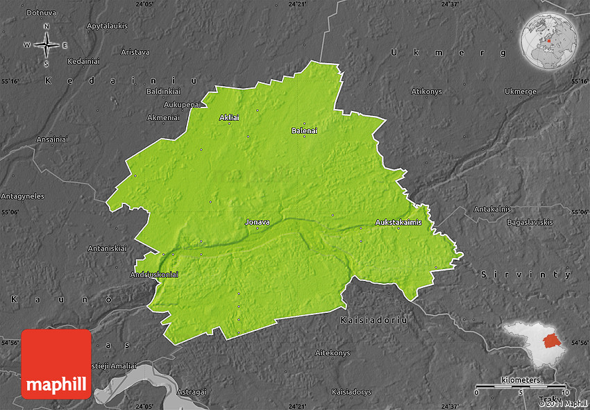 Each map type offers different information and each map style is designed for a different purpose. Read about the styles and map projection used in the above map (Physical Map of Jonavos, darken, desaturated).