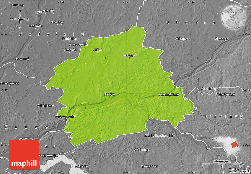 Each map type offers different information and each map style is designed for a different purpose. Read about the styles and map projection used in the above map (Physical Map of Jonavos, desaturated).