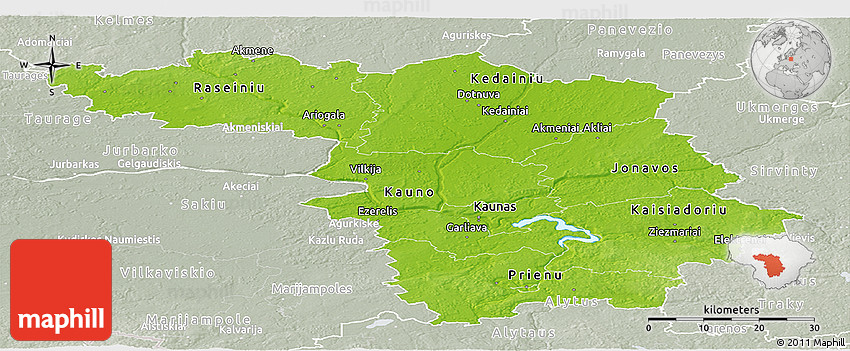 Physical map illustrates the mountains, lowlands, oceans, lakes and rivers and other physical landscape features of Kaunas. Differences in land elevations relative to the sea level are represented by color.