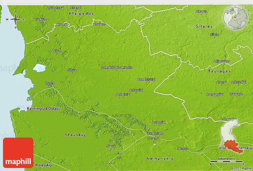 The 3D physical map represents one of several map types and styles available. Look at Siltues, Klaipeda, Lithuania from different perspectives.