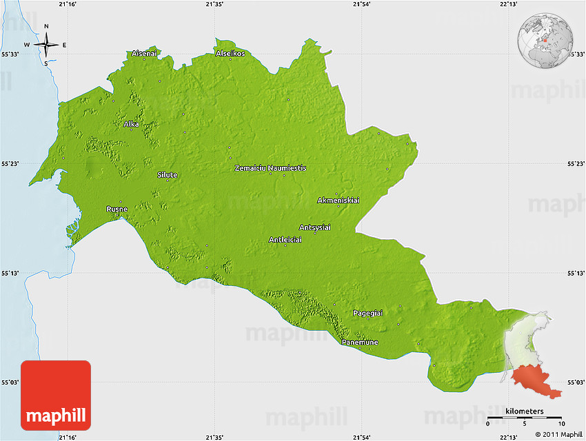 The flat physical map represents one of several map types and styles available. Look at Siltues, Klaipeda, Lithuania from different perspectives.