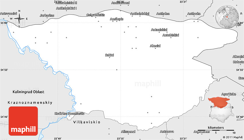 The simple silver style outline map represents one of several map types and styles available. Look at Sakiu, Marijampole, Lithuania from different perspectives.