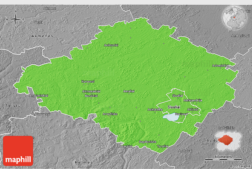 Each map type offers different information and each map style is designed for a different purpose. Read about the styles and map projection used in the above map (Political 3D Map of Siauliu, desaturated).