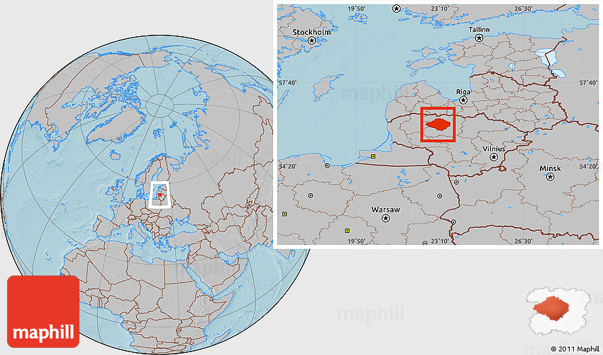 Maphill is a collection of map images. This image combines a gray map with the globe centered on Siauliu. Use the buttons under the image to switch to different map types.
