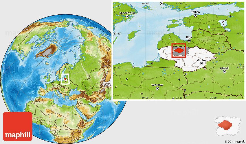 Maphill is a collection of map images. This image combines a physical map with the globe centered on Siauliu. Use the buttons under the image to switch to different map types.