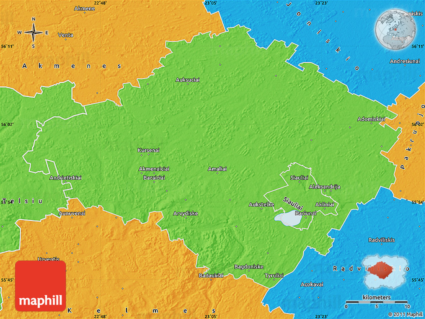 The flat political map represents one of several map types and styles available. Look at Siauliu, Siauliai, Lithuania from different perspectives.