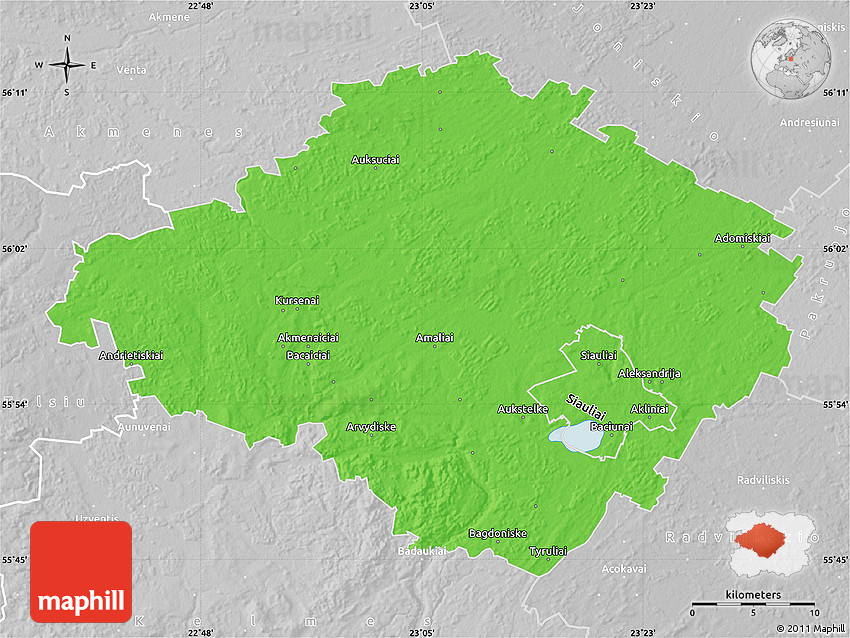 The flat political map represents one of several map types and styles available. Look at Siauliu, Siauliai, Lithuania from different perspectives.