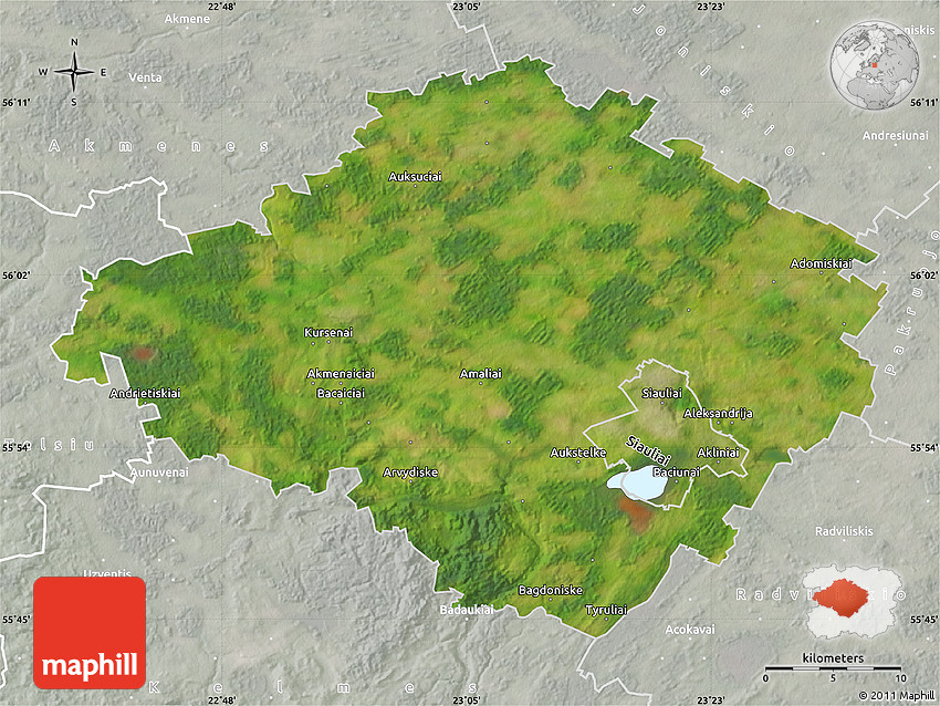 Each map type offers different information and each map style is designed for a different purpose. Read about the styles and map projection used in the above map (Satellite Map of Siauliu, lighten, semi-desaturated).