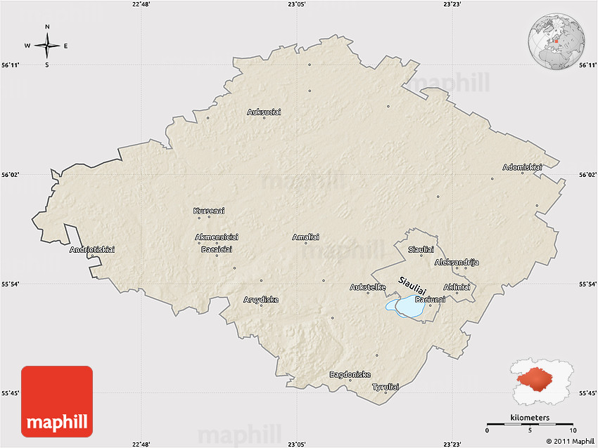 The flat shaded relief map represents one of several map types and styles available. Look at Siauliu, Siauliai, Lithuania from different perspectives.