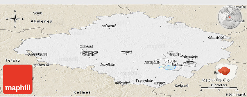 This map uses colors of vintage antique maps. Siauliu is highlighted with white. The rest of the map is beige colored shaded relief map.