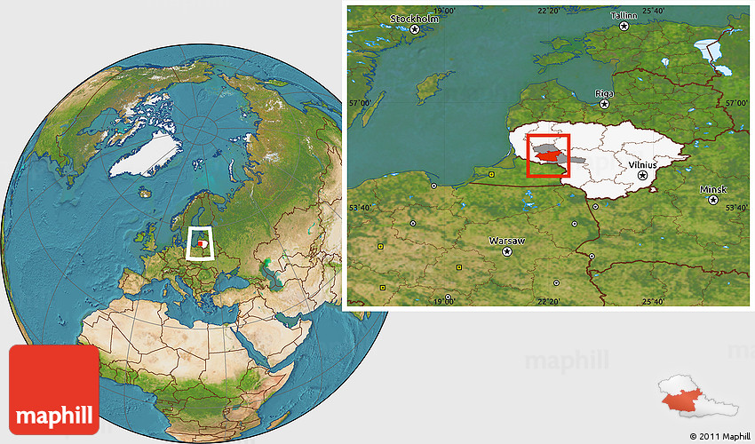 Maphill is a collection of map images. This image combines a satellite map with the globe centered on Taurages. Use the buttons under the image to switch to different map types.
