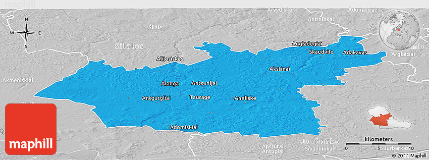 The panoramic political map represents one of several map types and styles available. Look at Taurages, Taurage, Lithuania from different perspectives.