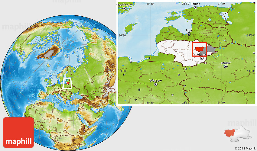 Maphill is a collection of map images. This image combines a physical map with the globe centered on Anyksciu. Use the buttons under the image to switch to different map types.