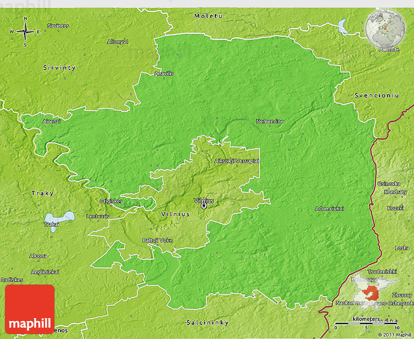 Physical map illustrates the mountains, lowlands, oceans, lakes and rivers and other physical landscape features of Vilniaus. Differences in land elevations relative to the sea level are represented by color.