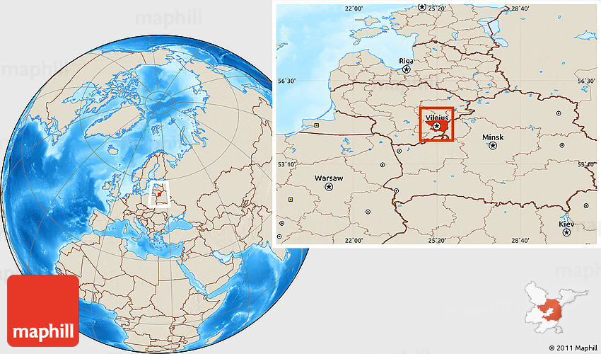 Maphill is a collection of map images. This image combines a shaded relief map with the globe centered on Vilniaus. Use the buttons under the image to switch to different map types.