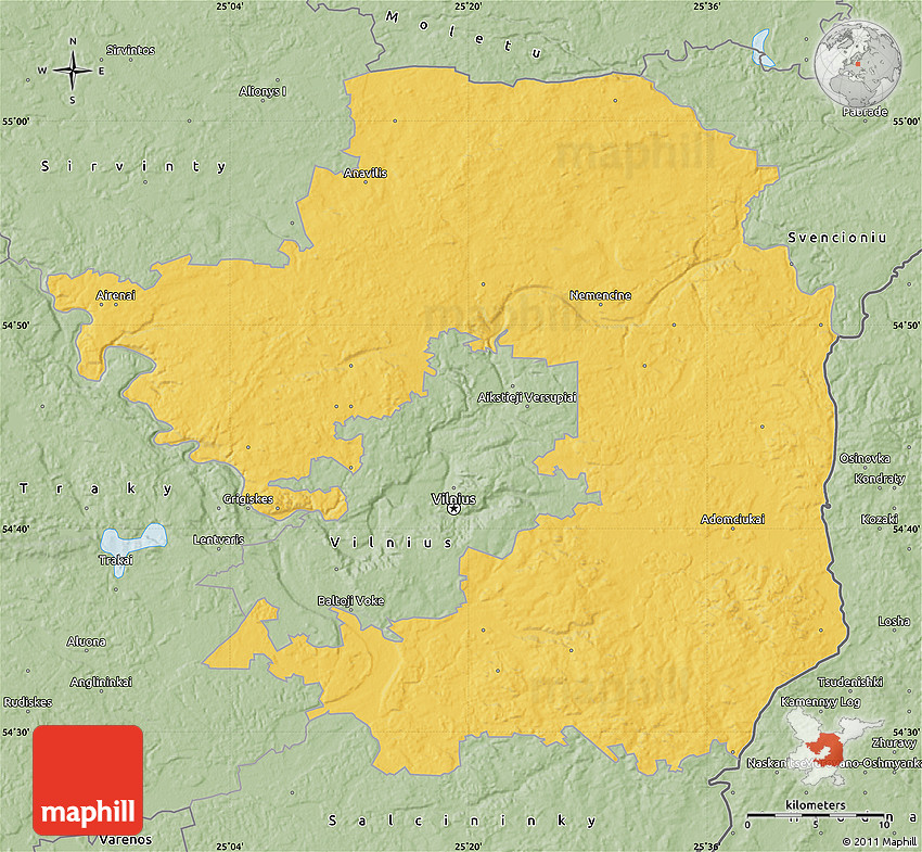 The flat savanna style map represents one of several map types and styles available. Look at Vilniaus, Vilnius, Lithuania from different perspectives.