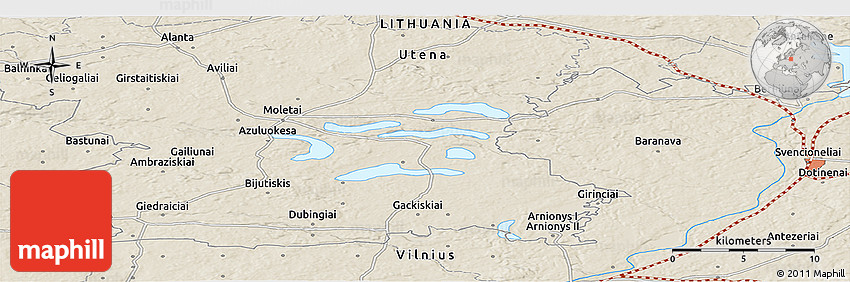 The panoramic shaded relief map represents one of many map types and styles available. Look at Maseliškės, Vilniaus, Vilnius, Lithuania from different perspectives.