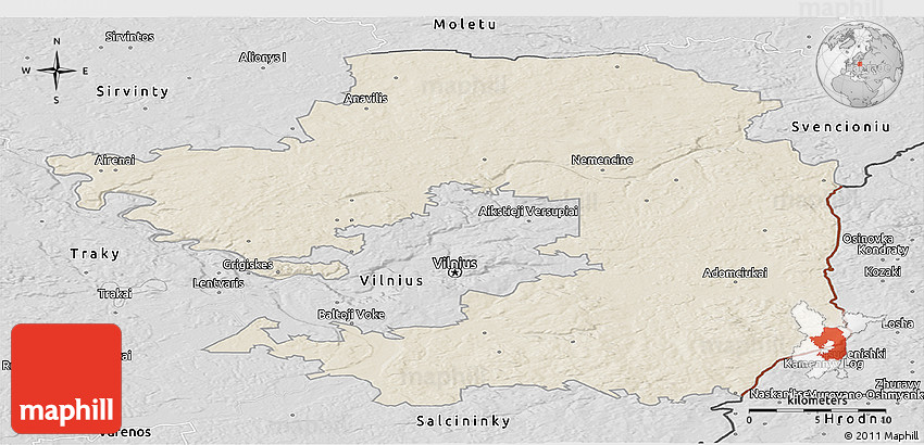 Shaded relief map shows landscape features, such as mountains, valleys and plateaus. Flat areas are smooth on the map, areas with steep slopes and mountains appear more rough. The above map of Vilniaus was created using a digital elevation model.