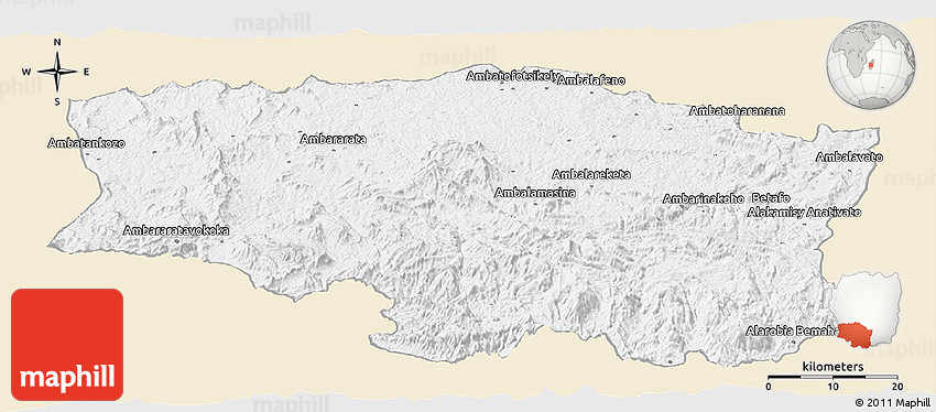 This map uses colors of vintage antique maps. Betafo is highlighted with white. The rest of the map is beige colored shaded relief map.