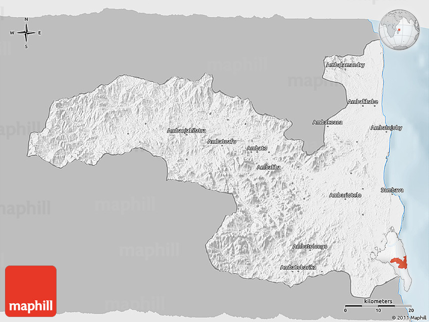 The 3D gray map represents one of several map types and styles available. Look at Sambava, Antsiranana, Madagascar from different perspectives.