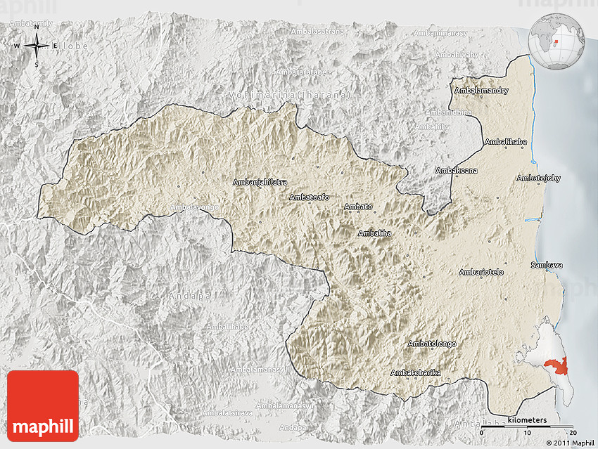 Shaded relief map shows landscape features, such as mountains, valleys and plateaus. Flat areas are smooth on the map, areas with steep slopes and mountains appear more rough. The above map of Sambava was created using a digital elevation model.