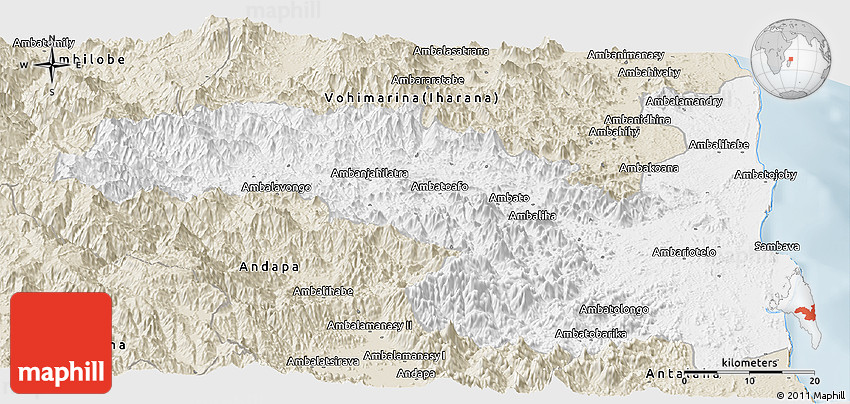This map uses colors of vintage antique maps. Sambava is highlighted with white. The rest of the map is beige colored shaded relief map.