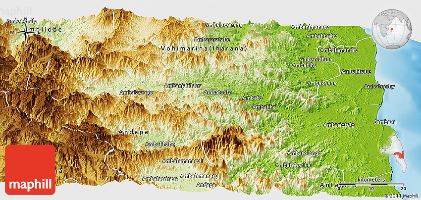 Physical map illustrates the mountains, lowlands, oceans, lakes and rivers and other physical landscape features of Sambava. Differences in land elevations relative to the sea level are represented by color.