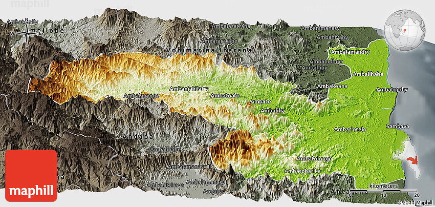 Physical map illustrates the mountains, lowlands, oceans, lakes and rivers and other physical landscape features of Sambava. Differences in land elevations relative to the sea level are represented by color.