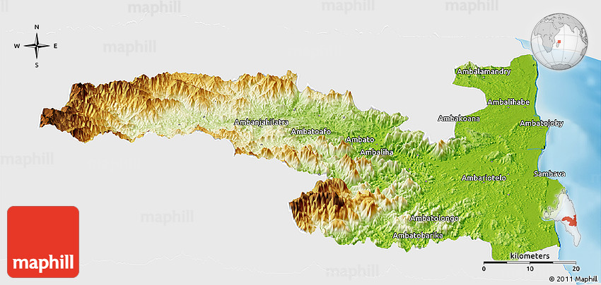 Physical map illustrates the mountains, lowlands, oceans, lakes and rivers and other physical landscape features of Sambava. Differences in land elevations relative to the sea level are represented by color.