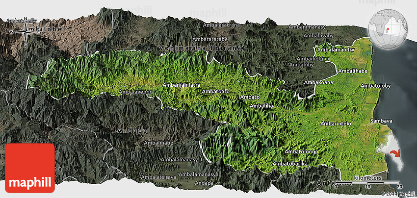 The panoramic satellite map represents one of several map types and styles available. Look at Sambava, Antsiranana, Madagascar from different perspectives.