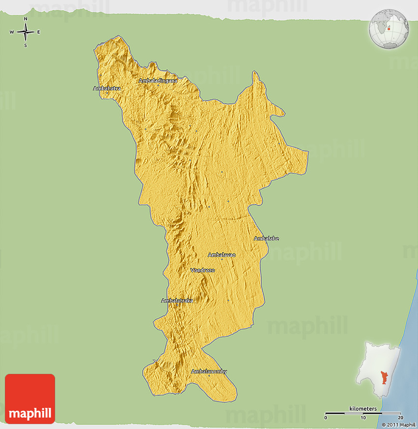 The 3D savanna style map represents one of several map types and styles available. Look at Vondrozo, Fianarantsoa, Madagascar from different perspectives.
