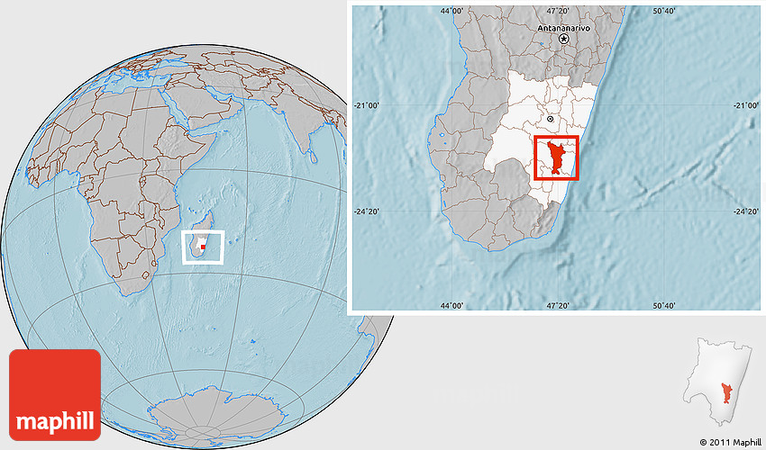 Maphill is a collection of map images. This image combines a gray map with the globe centered on Vondrozo. Use the buttons under the image to switch to different map types.