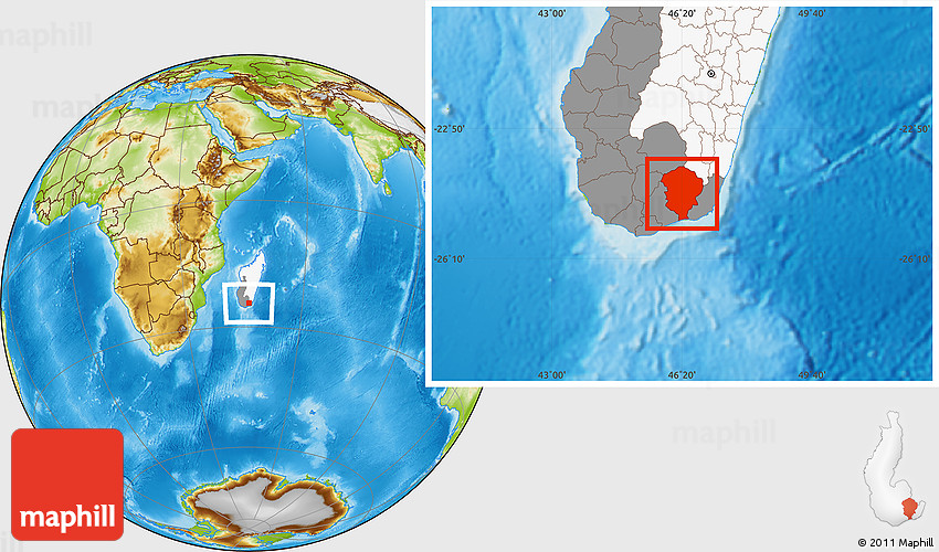 Maphill is a collection of map images. This image combines a physical map with the globe centered on Amboasary-Sud. Use the buttons under the image to switch to different map types.