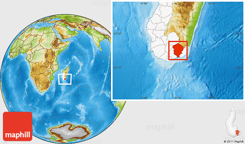 Maphill is a collection of map images. This image combines a physical map with the globe centered on Amboasary-Sud. Use the buttons under the image to switch to different map types.