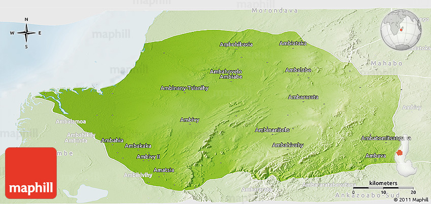 The panoramic physical map represents one of several map types and styles available. Look at Manja, Toliary, Madagascar from different perspectives.