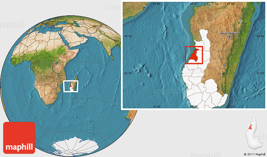 Maphill is a collection of map images. This image combines a satellite map with the globe centered on Morondava. Use the buttons under the image to switch to different map types.