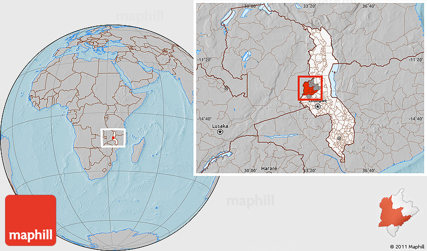 Maphill is a collection of map images. This image combines a gray map with the globe centered on Kaomba. Use the buttons under the image to switch to different map types.