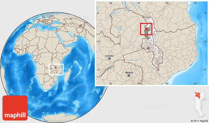 Maphill is a collection of map images. This image combines a shaded relief map with the globe centered on Mpherembe. Use the buttons under the image to switch to different map types.