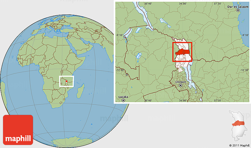 Maphill is a collection of map images. This image combines a savanna style map with the globe centered on Rumphi. Use the buttons under the image to switch to different map types.