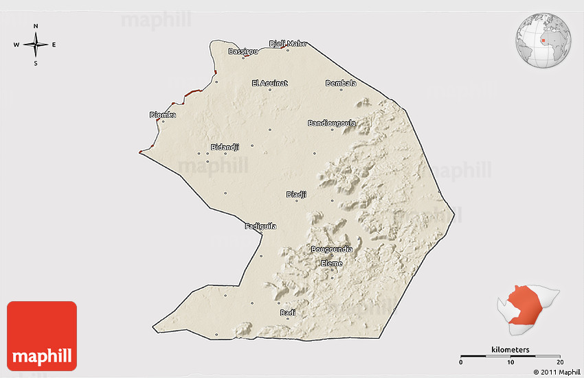 Shaded relief map shows landscape features, such as mountains, valleys and plateaus. Flat areas are smooth on the map, areas with steep slopes and mountains appear more rough. The above map of Yelimane-Central was created using a digital elevation model.