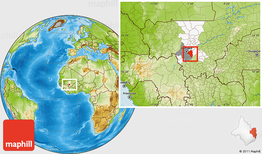 Maphill is a collection of map images. This image combines a physical map with the globe centered on Baguineda. Use the buttons under the image to switch to different map types.