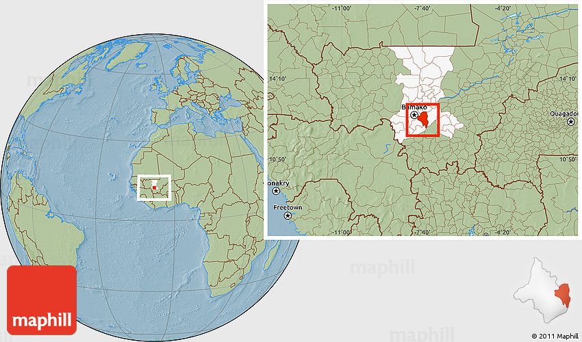 Maphill is a collection of map images. This image combines a savanna style map with the globe centered on Baguineda. Use the buttons under the image to switch to different map types.