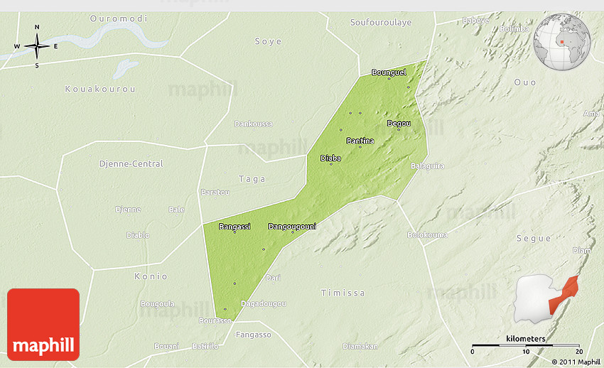 The 3D physical map represents one of several map types available. Look at Sofara, Djenne, Mopti, Mali from different perspectives.