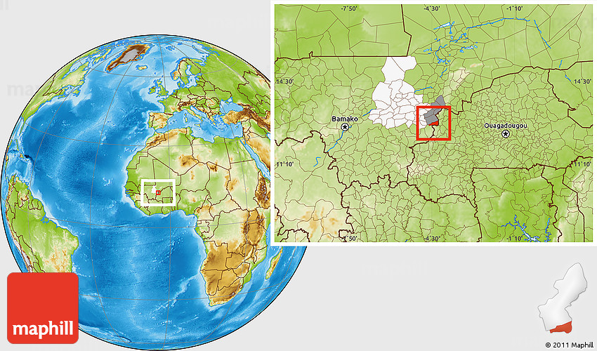 Maphill is a collection of map images. This image combines a physical map with the globe centered on Mafoune. Use the buttons under the image to switch to different map types.