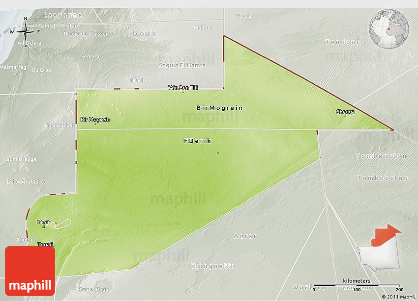 Physical map illustrates the mountains, lowlands, oceans, lakes and rivers and other physical landscape features of Tiris Zemmour. Differences in land elevations relative to the sea level are represented by color.
